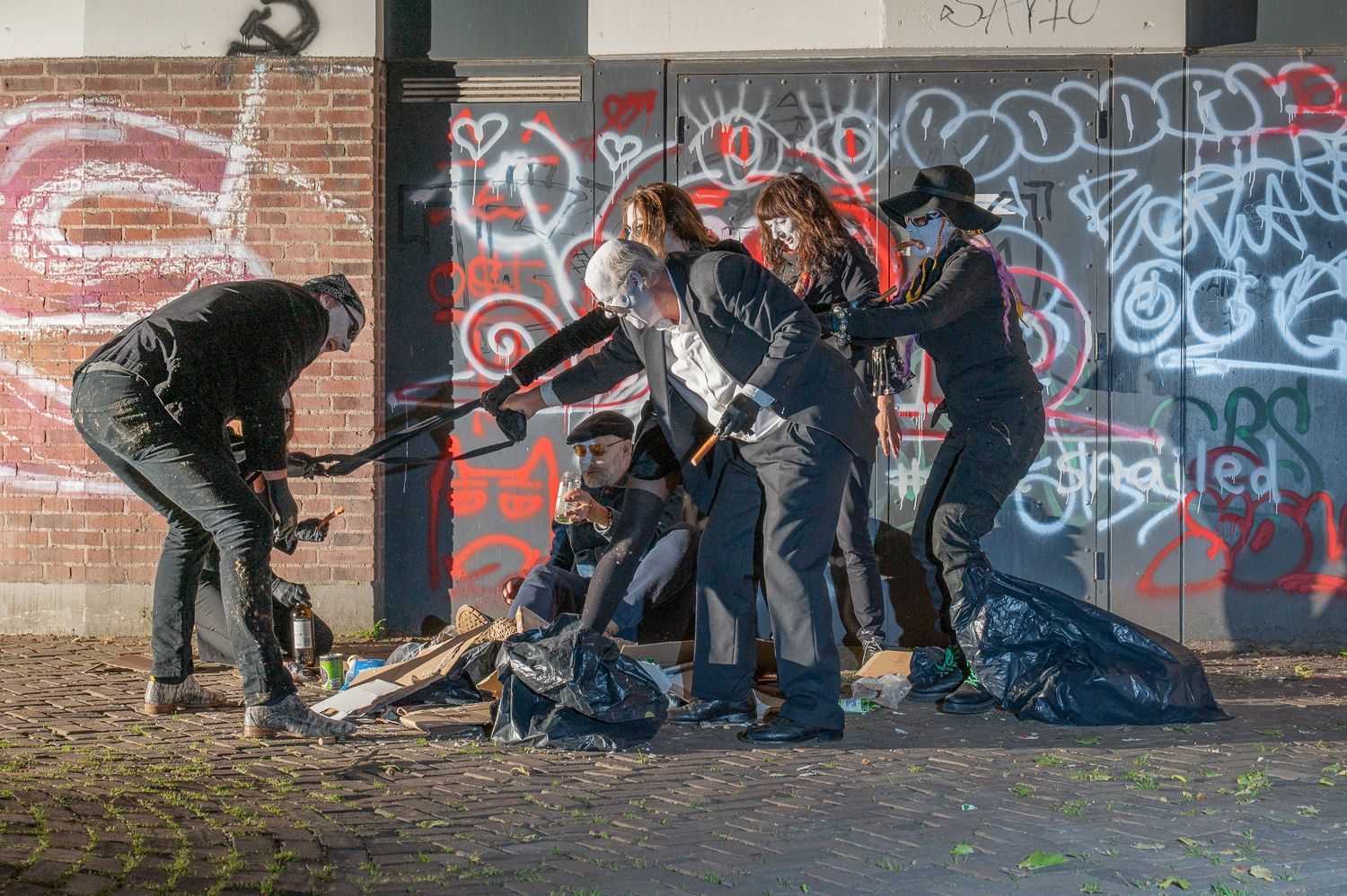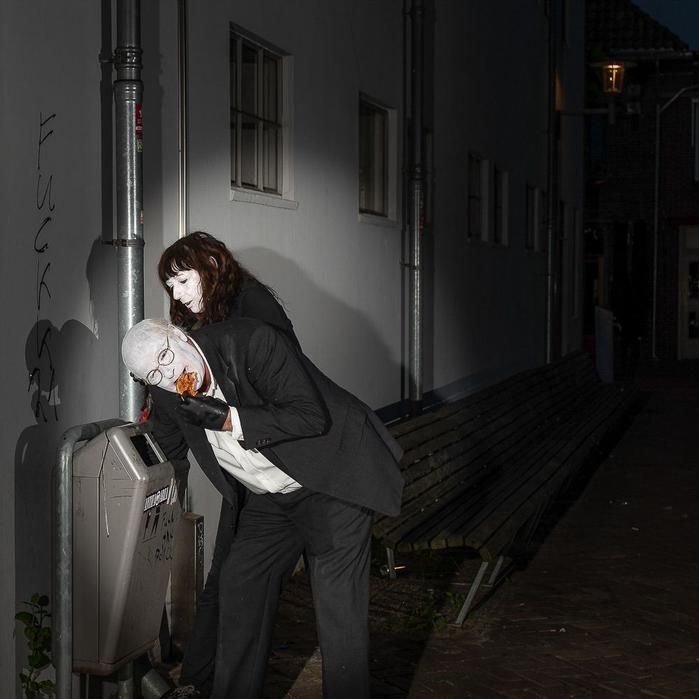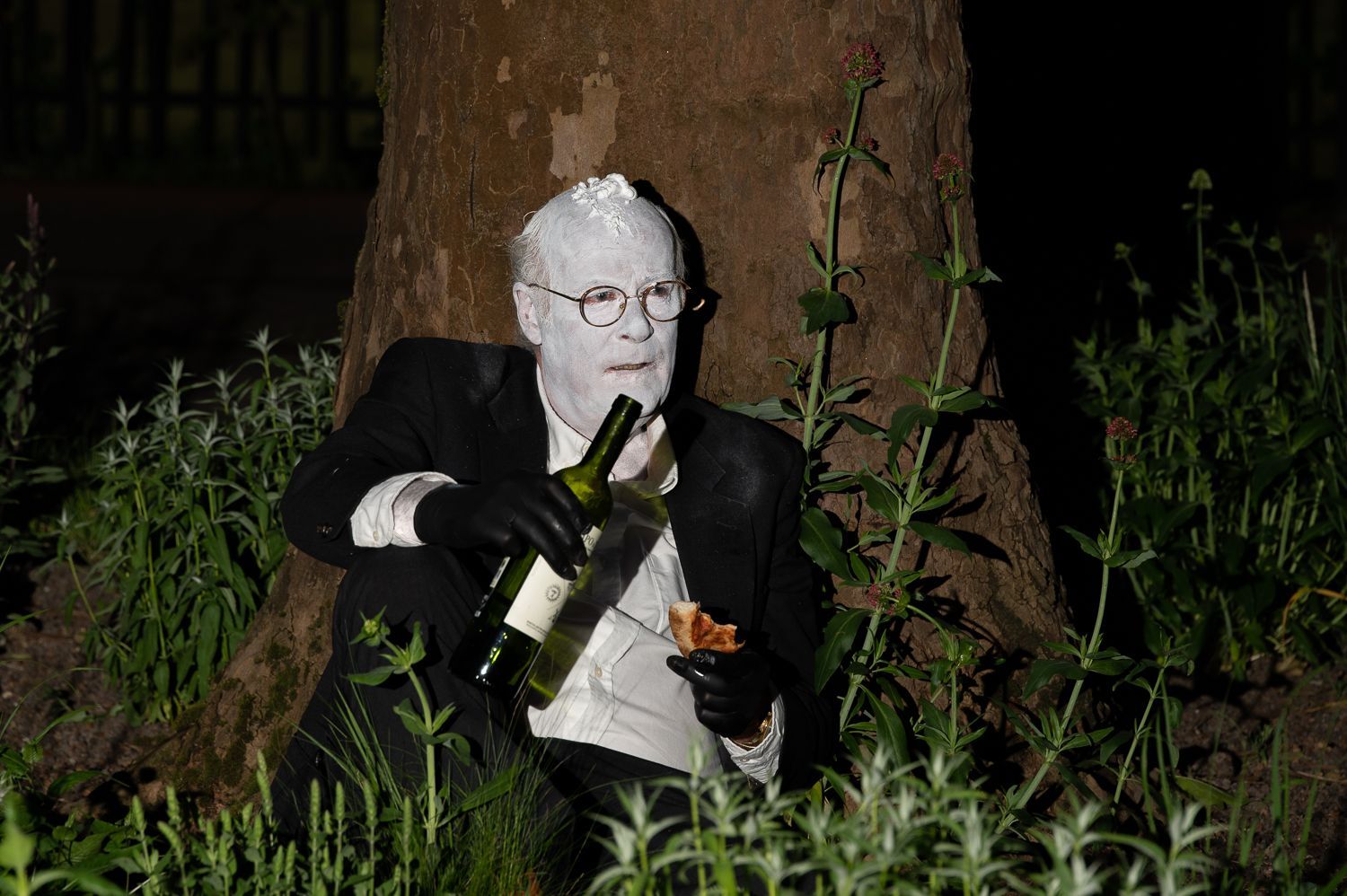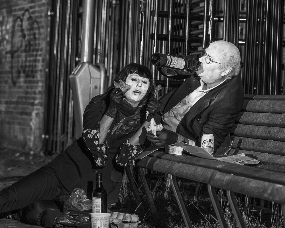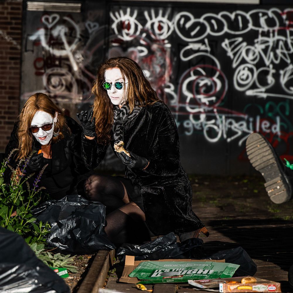 Tijdens de dag doen ze zich voor als upper-class, zogenaamd geslaagd voor de buitenwereld. Niemand ziet dat de slager de biefstuk in een enveloppe onder de voordeur naar binnen schuift, daar waar de auto op stoep staat te glimmen. Maar 's nachts moeten ze op zoek naar voedsel, als wilde beesten. Hun witte gelaat moet voorkomen dat ze elkaar in 't donker kwijtraken. Met knorrende magen legen ze de afvalzakken.