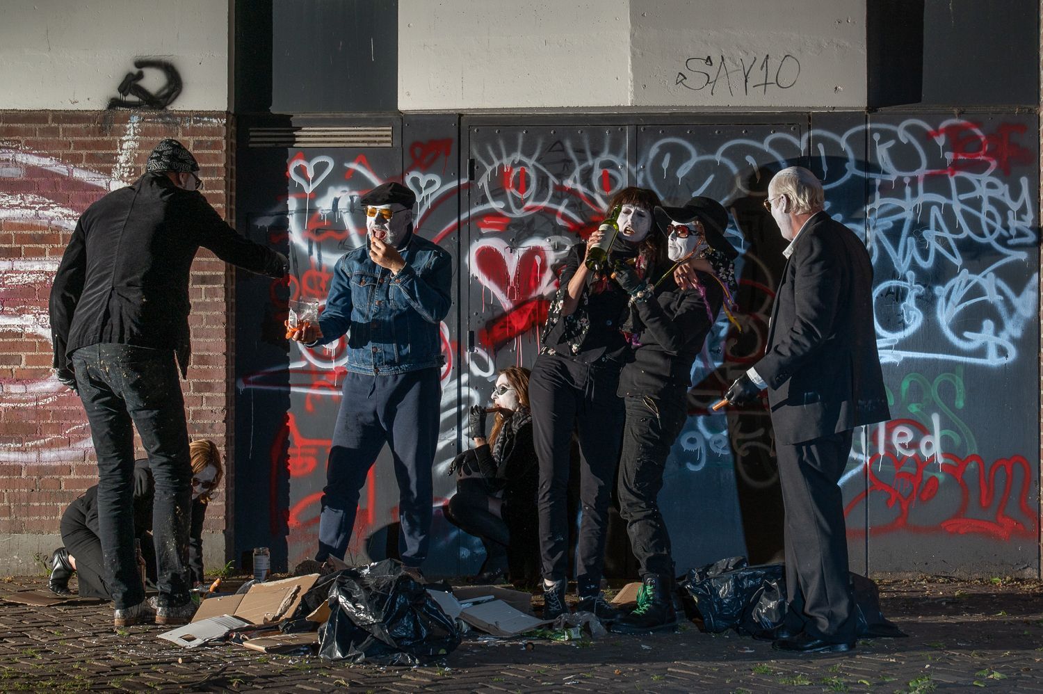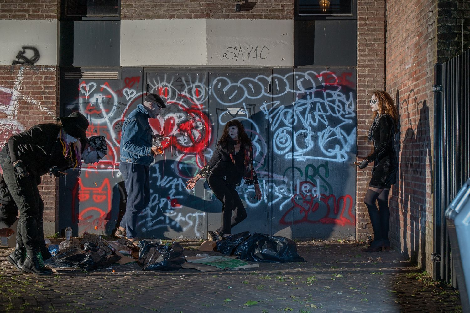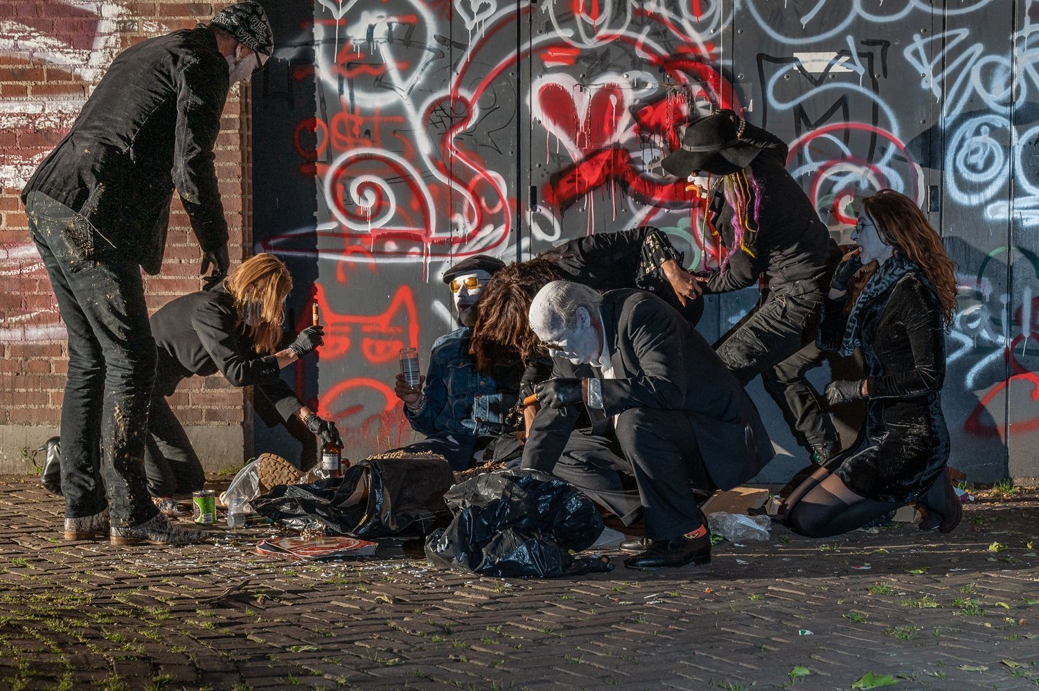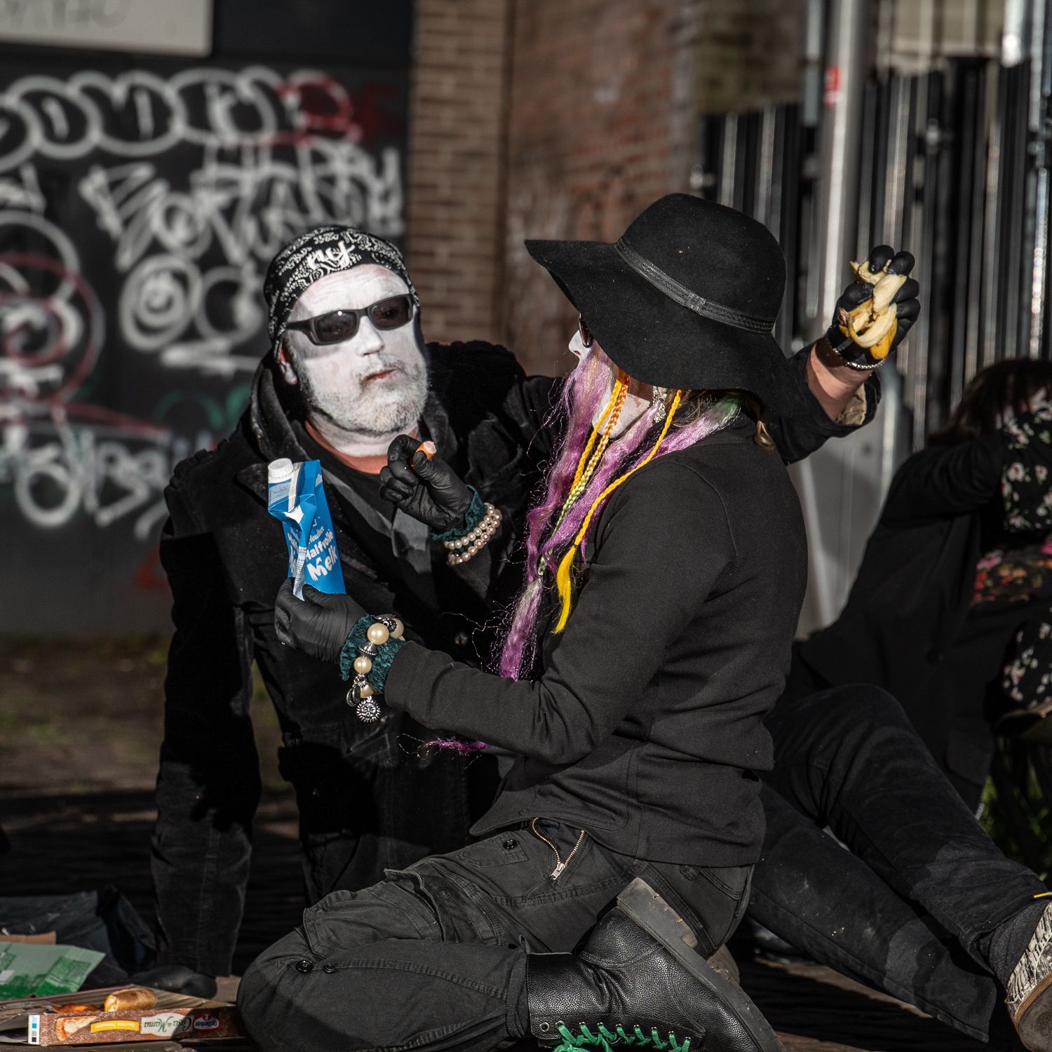 Tijdens de dag doen ze zich voor als upper-class, zogenaamd geslaagd voor de buitenwereld. Niemand ziet dat de slager de biefstuk in een enveloppe onder de voordeur naar binnen schuift, daar waar de auto op stoep staat te glimmen. Maar 's nachts moeten ze op zoek naar voedsel, als wilde beesten. Hun witte gelaat moet voorkomen dat ze elkaar in 't donker kwijtraken. Met knorrende magen legen ze de afvalzakken.